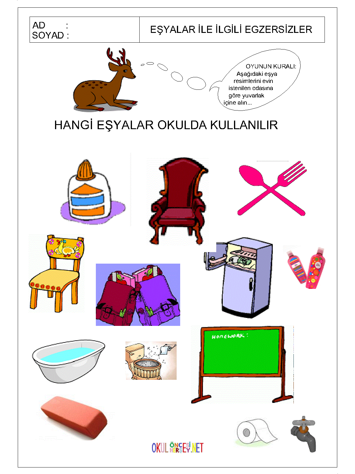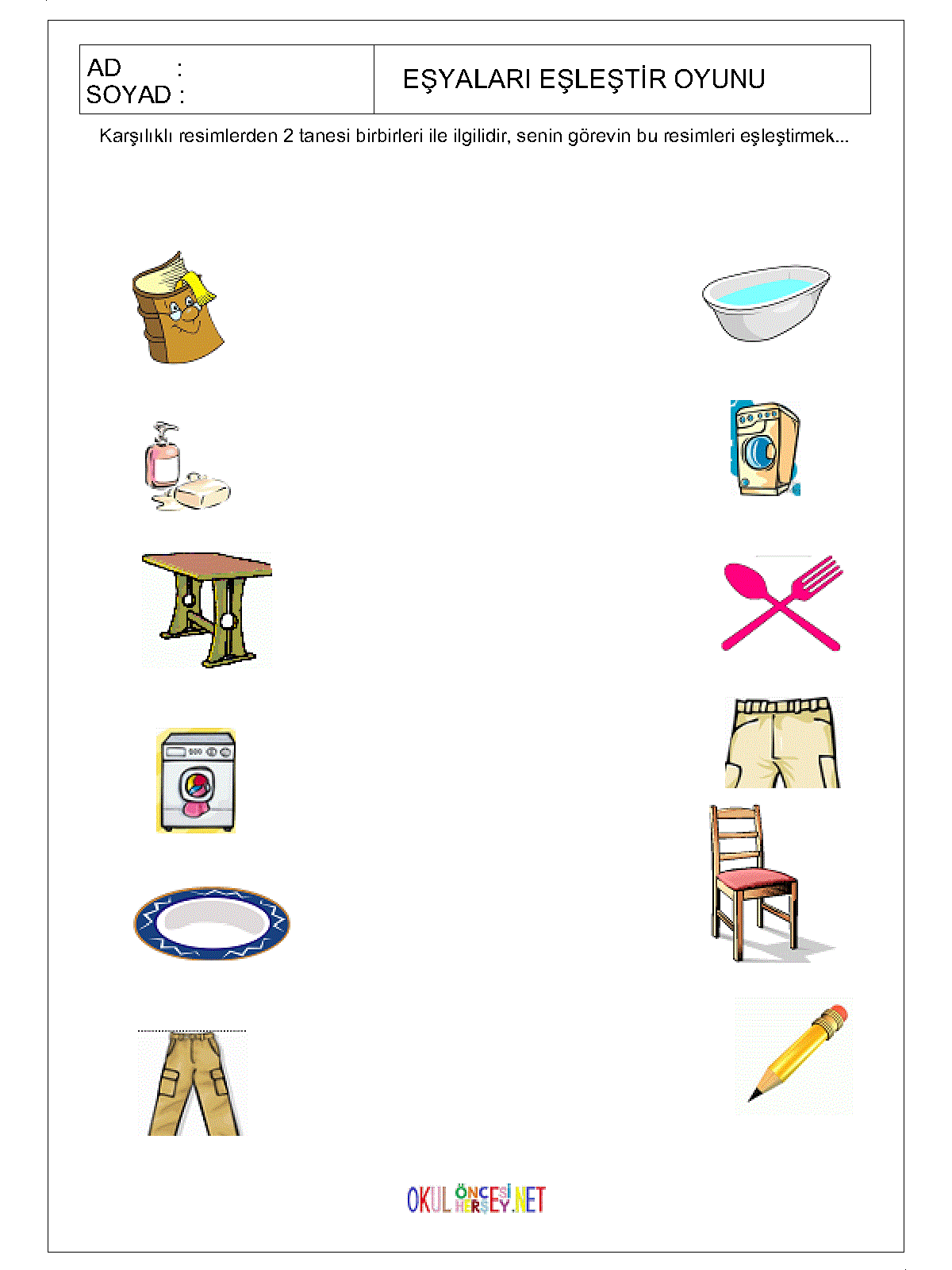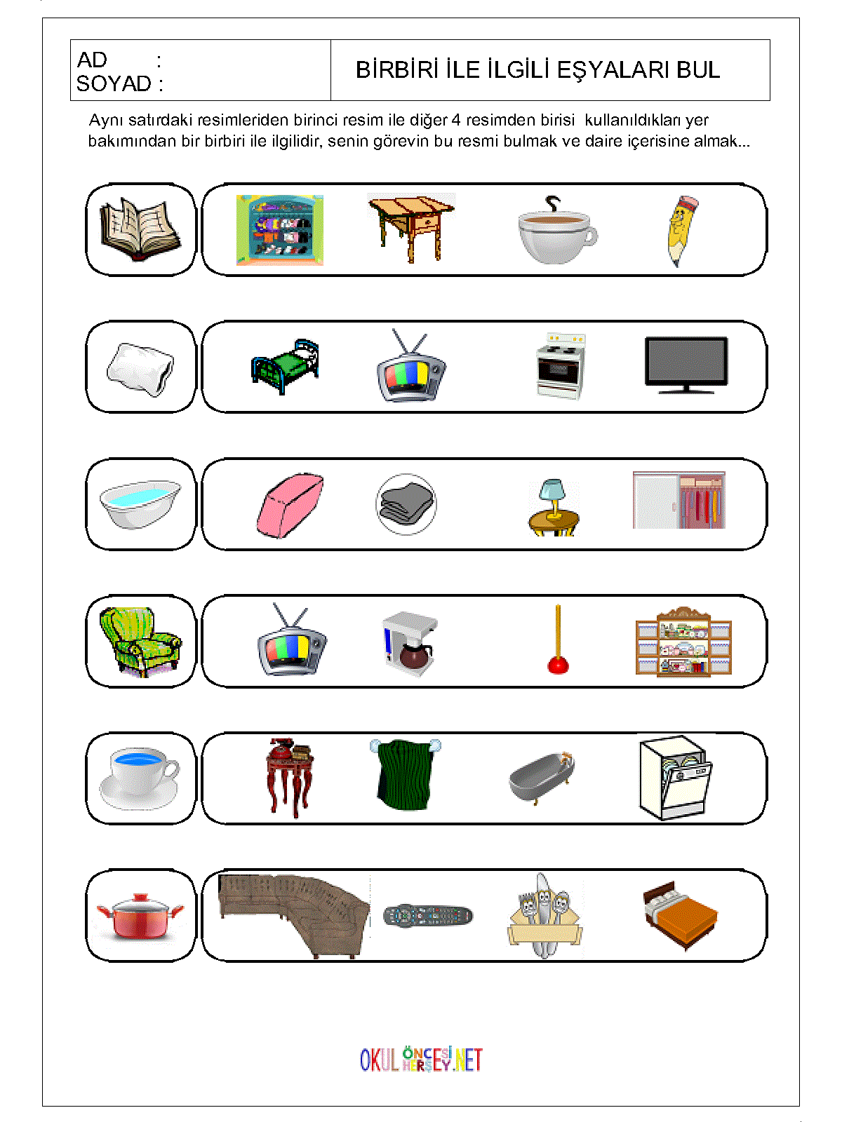 Okulonceshersey.net ekibi çocuklarınız için bir çok eşya kavramı çalışma sayfası hazırlamış ve onların gelişimlerine katkıda bulunmanız için siz anne ve babaların hizmetine sunmuştur. Bu sayfadan isdetiğiniz çalışma sayfasını bilgisayarınıza indirebilir ve çocuklarınız için yazdırabilirsiniz.